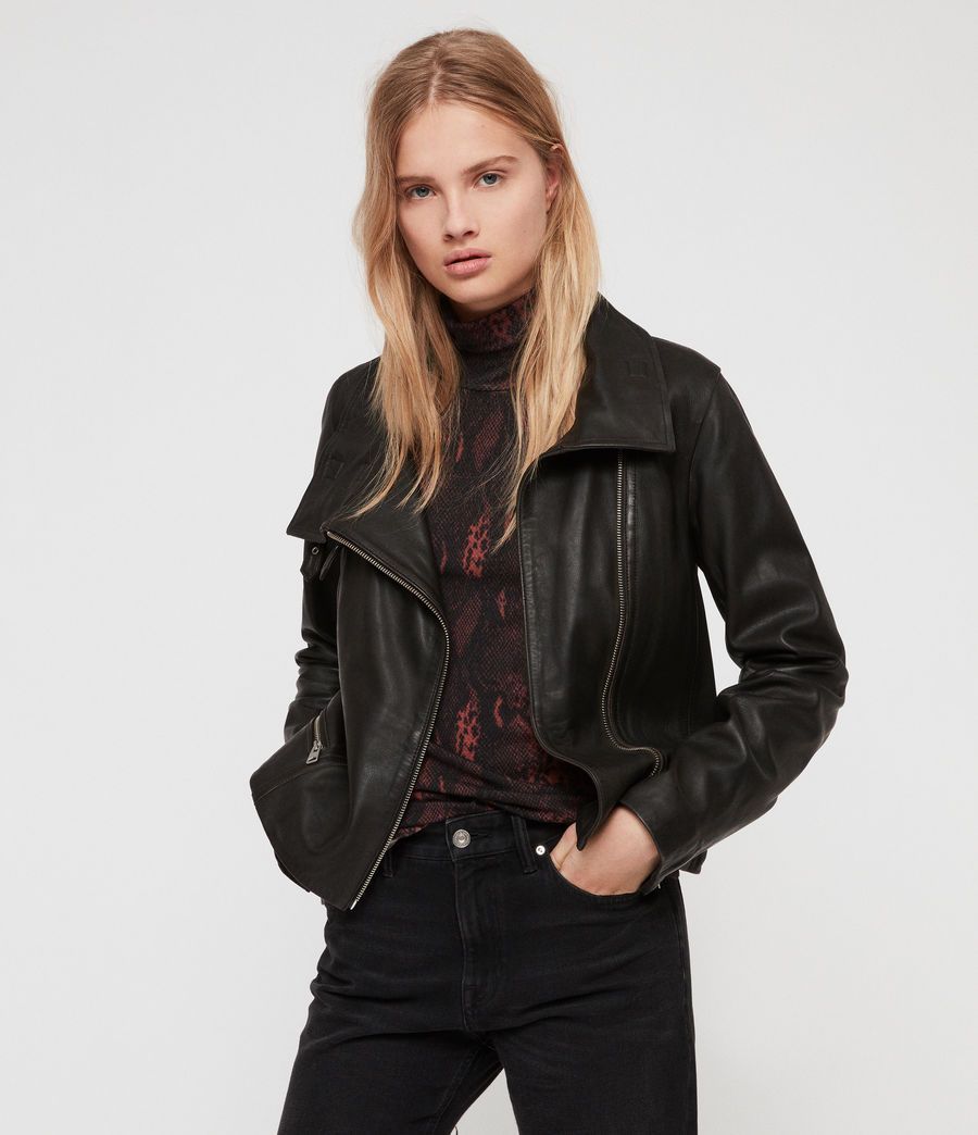 Renowned biker aesthetic. Our best-selling Bales Biker Jacket stands out with its high funnel neck collar and double buckle fastenings. Expertly crafted from lamb leather and cut to a flattering slim fit.