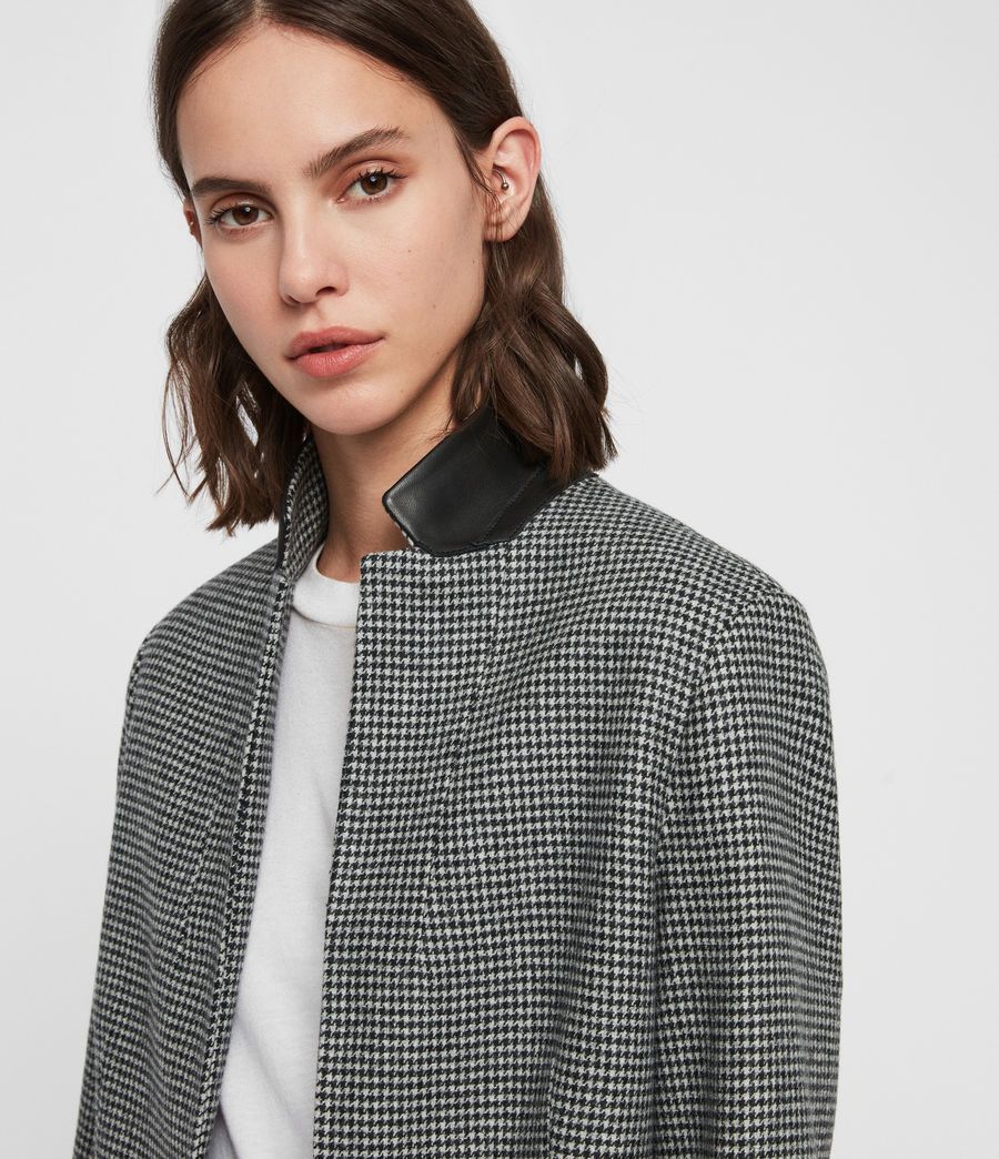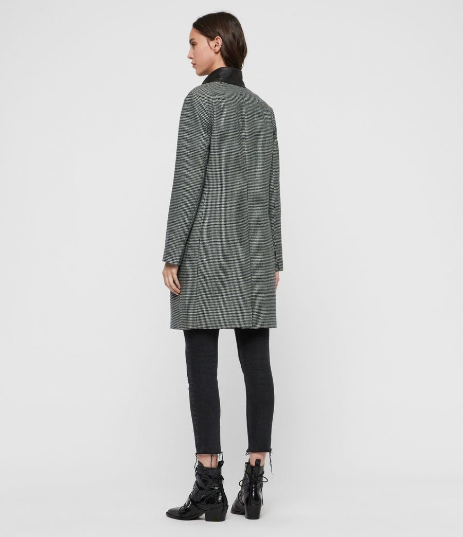 Tailored to perfection. The best-selling Leni Coat has been pulled from the archive this season. Crafted from a soft Italian wool-blend in all over monochrome dogtooth with a supple leather collar – an Extremes finish.